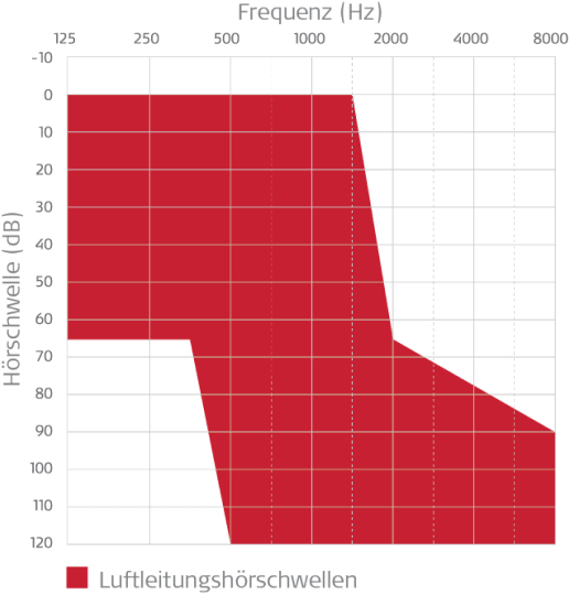- Hochtonsteilabfall ab ca. 1500 Hz (Luftleitungshörschwellen) – siehe rot markierten Bereich im Diagramm