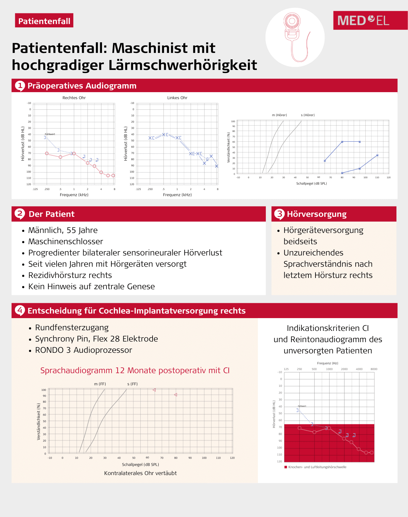 Nach jahrzehntelanger Tätigkeit bei hohem Lärmpegel in der Stahlindustrie wurde ein 55-jähriger Maschinist mit schwerem progredientem Hörverlust und unzureichendem Sprachverständnis vorstellig. Rezidivierende Hörstürze trugen zusätzlich dazu bei, dass eine Versorgung mit Hörgeräten nicht mehr ausreichte.